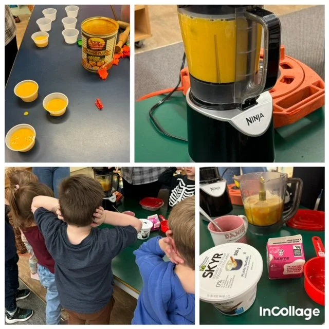 We’ve had a fun and busy month in the Rainbow Room, starting with our celebration of the Festival of Light, called Diwali. We learned about the significance of this festival, and what we could do to celebrate it. We painted clay Diyas and coloured pictures of Rangolis. Vibha brought in lovely bracelets, dolls and saris for the children to play with, and even helped some to put on a sari. We also had henna stamps on our hands. The home corner was decorated with beautiful draped saris and we kept a clean and tidy “house” for the holiday. We also made a delicious mango Lassi in Danielle’s blender: very noisy, but worth it; everyone loved the treat.